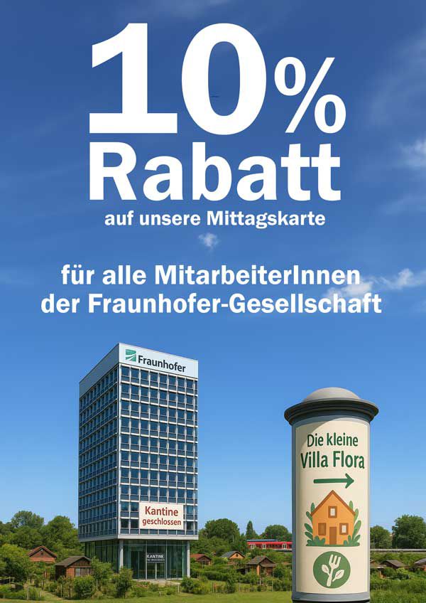 Solange die Kantine der Fraunhofer-Gesellschaft geschlossen bleibt, geben wir 10% Rabatt auf alle Gerichte der Mittagskarte. Wir freuen uns auf Euch!